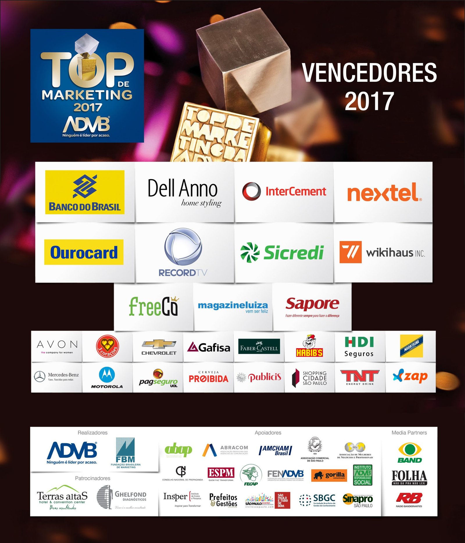 Uma noite de gala e de reconhecimento às melhores estratégias de comunicação empresarial. Considerado o Oscar do setor, o Top de Marketing 2017 da ADVB (Associação dos Dirigentes de Vendas e Marketing do Brasil) premiou na noite de quarta-feira (21/6), no Hotel Maksoud Plaza, na capital paulista, 27 empresas por seus cases inovadores. “É a 45ª edição do prêmio outorgado pela ADVB à comunidade e que nesta edição foi renovado e desenvolvido com nova metodologia. Foram meses de trabalho analisando 36 categorias de mercado, o market share de cada empresa, para chegarmos aos 27 cases premiados”, ressaltou o presidente da ADVB, Latif Abrão Jr.
