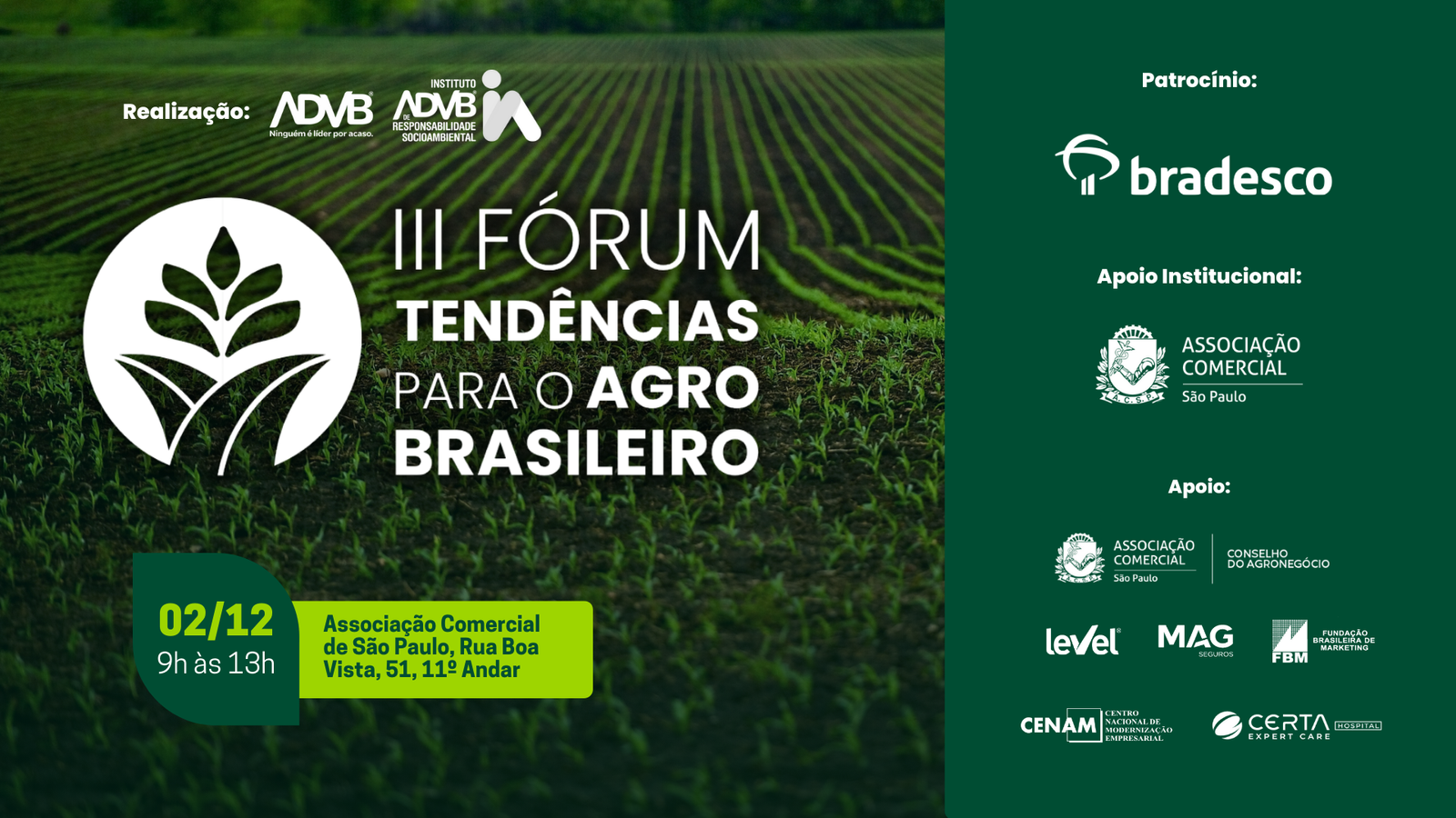 Com realização da ADVB e do Instituto ADVB de Responsabilidade Socioambiental, o III Fórum Tendências para o Agro Brasileiro conta com o patrocínio do Bradesco, apoio institucional da Associação Comercial de São Paulo (ACSP) e apoio técnico da Fundação Brasileira de Marketing (FBM), do Centro Nacional de Modernização Empresarial (CENAM) e da empresa Level.
