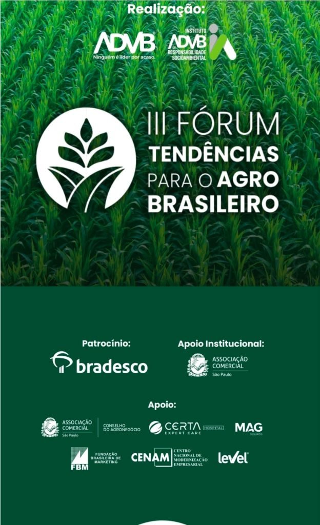 No dia 2 de dezembro de 2025, das 9h às 13h, a ADVB – Associação dos Dirigentes de Vendas e Marketing do Brasil realiza o III Fórum Tendências para o Agro Brasileiro, com o patrocínio institucional do Bradesco e a parceria do Instituto ADVB de Responsabilidade Socioambiental. O evento será realizado na sede da Associação Comercial de São Paulo (ACSP), localizada na Rua Boa Vista, 51 – 11º andar, e reunirá especialistas, empresários, executivos e representantes institucionais com o objetivo de debater o cenário atual e as perspectivas estratégicas para o setor agro no país. As inscrições são gratuitas e podem ser feitas pelo link: sympla.com.br/evento/3-forum-tendencia-para-o-agro-brasileiro.