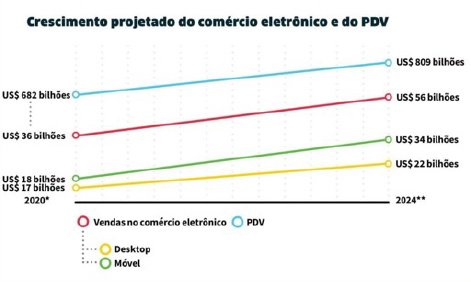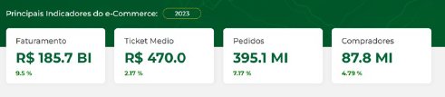 Do mercado total de 13,1% que o Comercio desempenhou em 2020 no PIB do pais, ou próximo a 1170 BiR$, o E-Commerce ocupava em 2020 cerca de 39 BiR$ ou seja próximo a 3,5% já em 2023 atingiu 186 BiR$ ou seja próximo a 16%, mas com tendencias de alta exponencial devendo atingir próximo a 40% em 2030. Os números são impressionantes por se tratando de transações voltadas a B2C e de Tickets baixos.