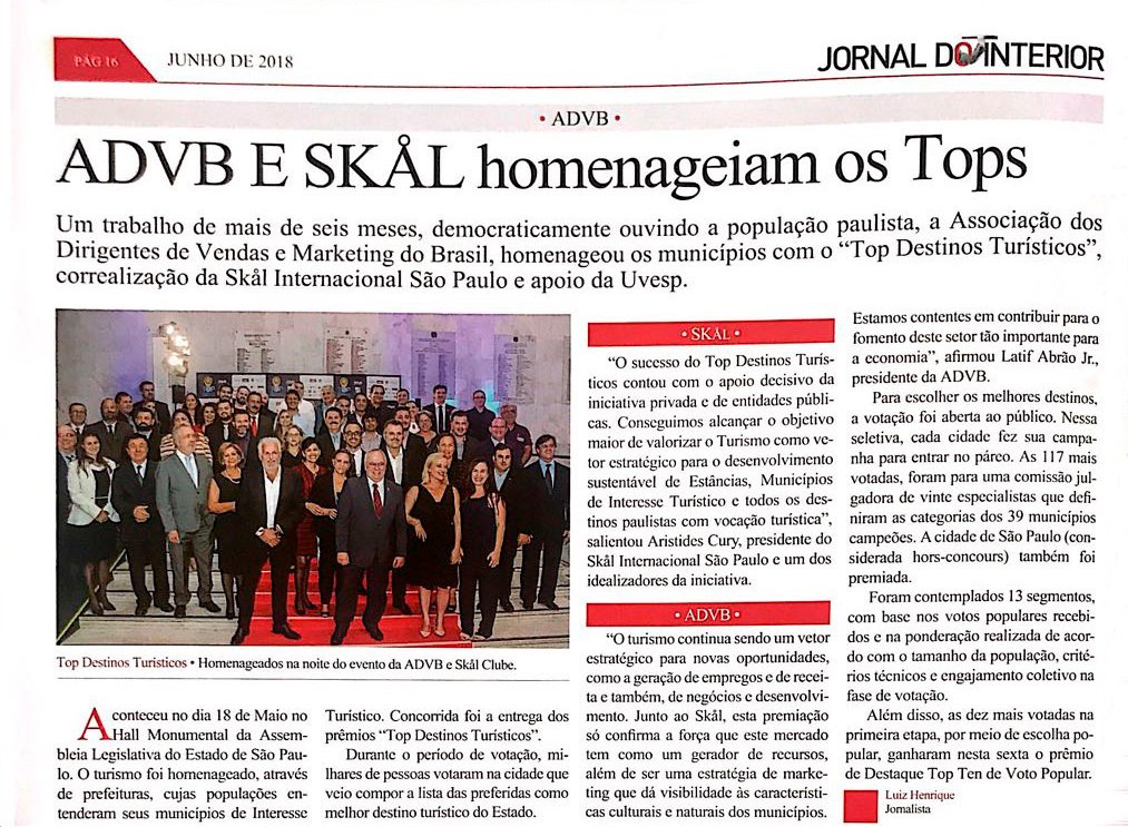 O Jornal do Interior, da UVESP, publicou uma matéria de duas páginas sobre a Premiação TOP Destinos Turísticos, destacando um trabalho de meses, democraticamente ouvindo a população paulista, que homenageou os municípios ganhadores.