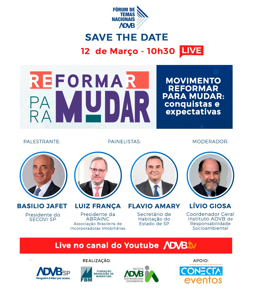 Live contará com os painelistas Luiz França – presidente da citada ABRAINC; e com Flávio Amary – Secretário de Habitação do Estado de São Paulo e ex-presidente do SECOVI-SP. Moderação caberá a Lívio Giosa, coordenador Geral do IRES. Ao lado de Jafet, são lideranças presentes desde o início do Movimento.