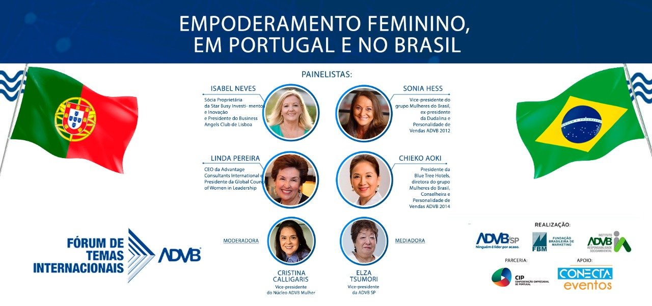 Sabedoria humana dedicada ao tema “Empoderamento Feminino, em Portugal e no Brasil”. A frase resume uma hora e vinte nove minutos de verdades, ditas e gravadas na manhã de 30/03/2021, por todas as quatro painelistas convidadas da Fundação Brasileira de Marketing para o Fórum de Temas Internacionais – FTI, da Associação dos Dirigentes de Vendas e Marketing do Brasil – ADVB.