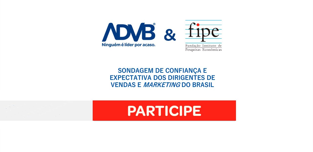 Olá! Gostaríamos de convidá-lo para participar da Sondagem de Confiança e Expectativa dos Dirigentes de Vendas e Marketing do Brasil. Trata-se de uma iniciativa da ADVB – Associação dos Dirigentes de Vendas e Marketing do Brasil – com apoio técnico da Fipe – Fundação Instituto de Pesquisas Econômicas. A sondagem tem como principal objetivo avaliar o grau de confiança e acompanhar a opinião de ocupantes de cargos de vendas e marketing, bem como de outras áreas estratégicas de empresas e organizações, com respeito à evolução e expectativa futura da economia brasileira e dos negócios. Os resultados das rodadas anteriores da sondagem estão disponíveis no site da ADVB. Esta é a sexta rodada da sondagem e gostaríamos de contar com a sua participação! O tempo médio de resposta ao questionário é de aproximadamente 5 minutos.