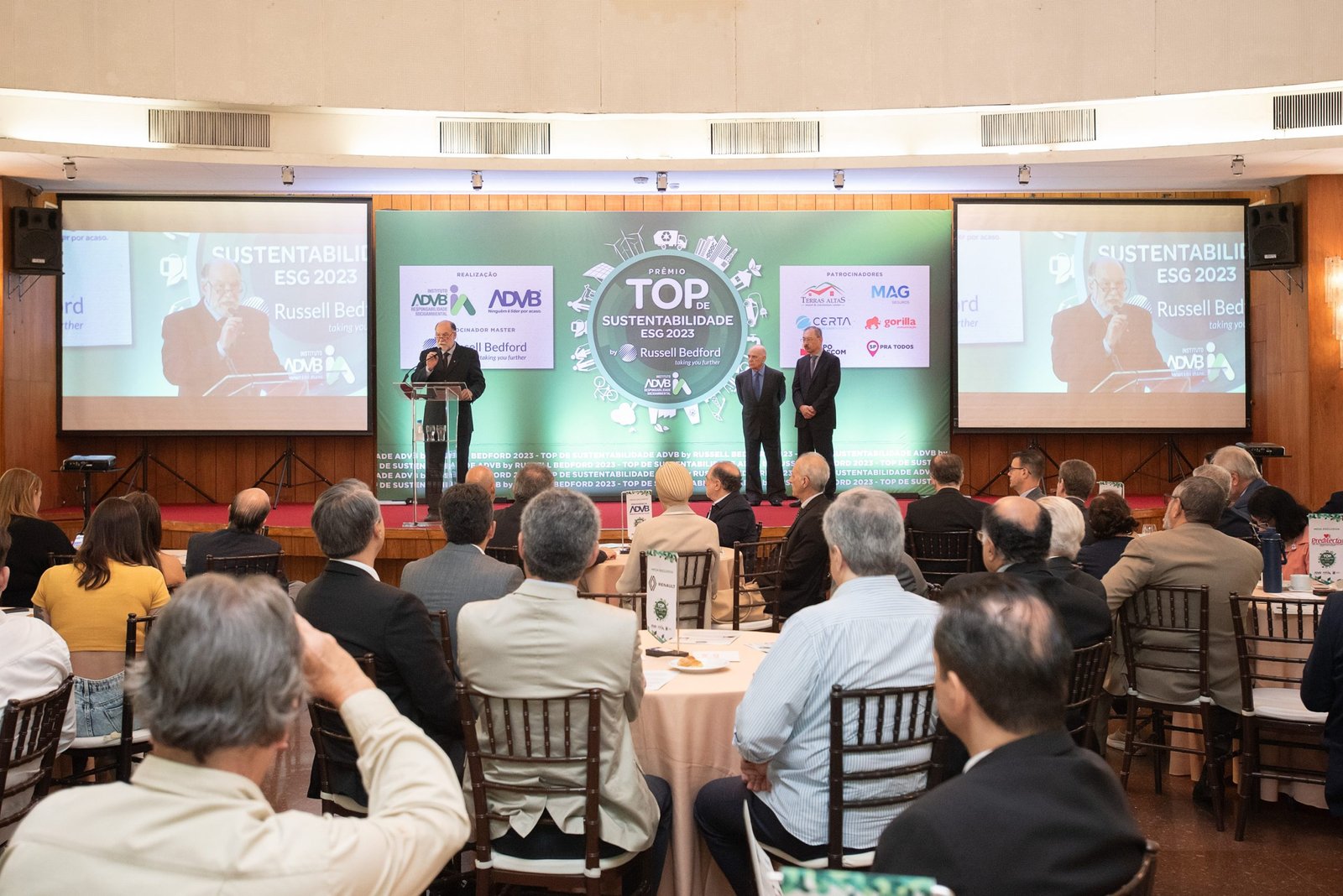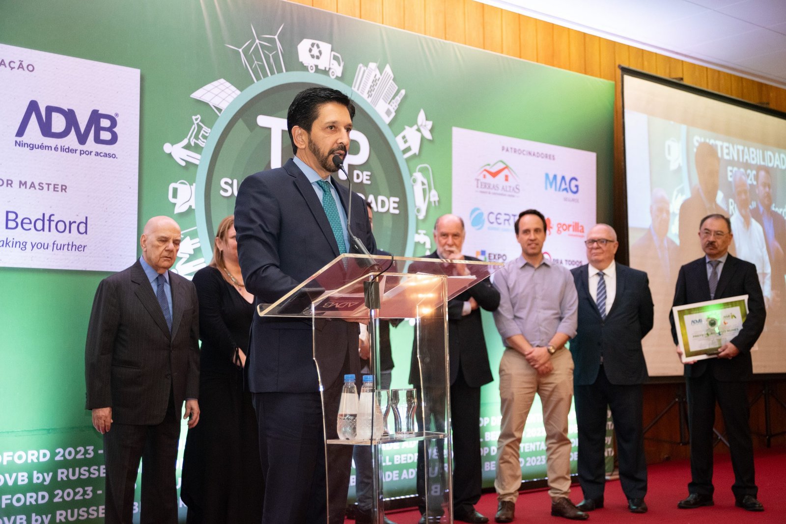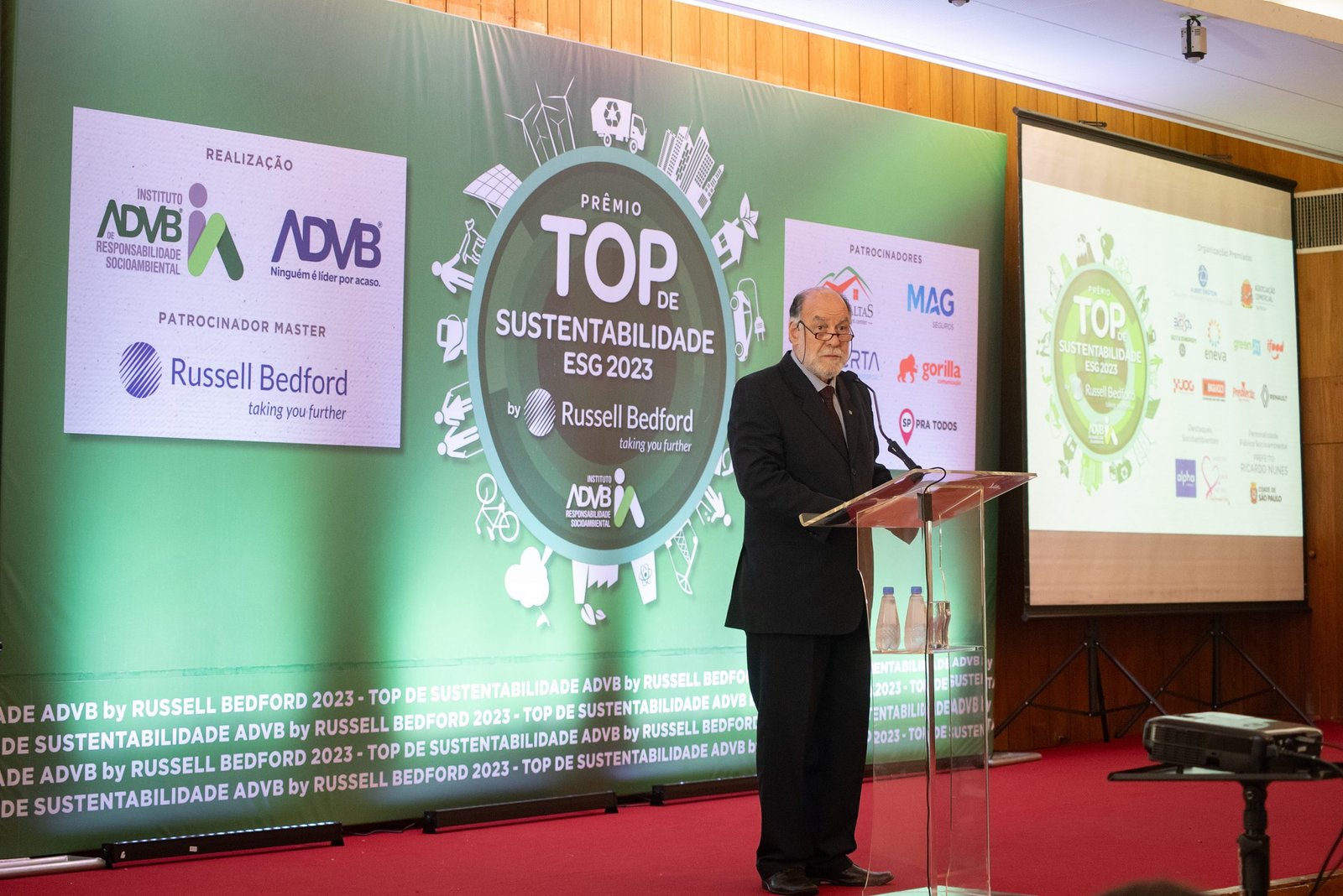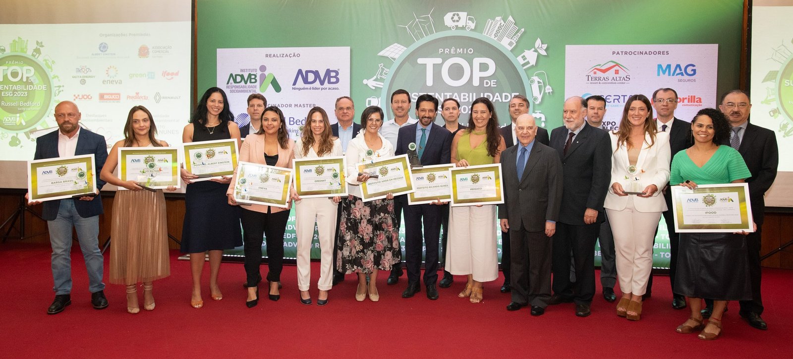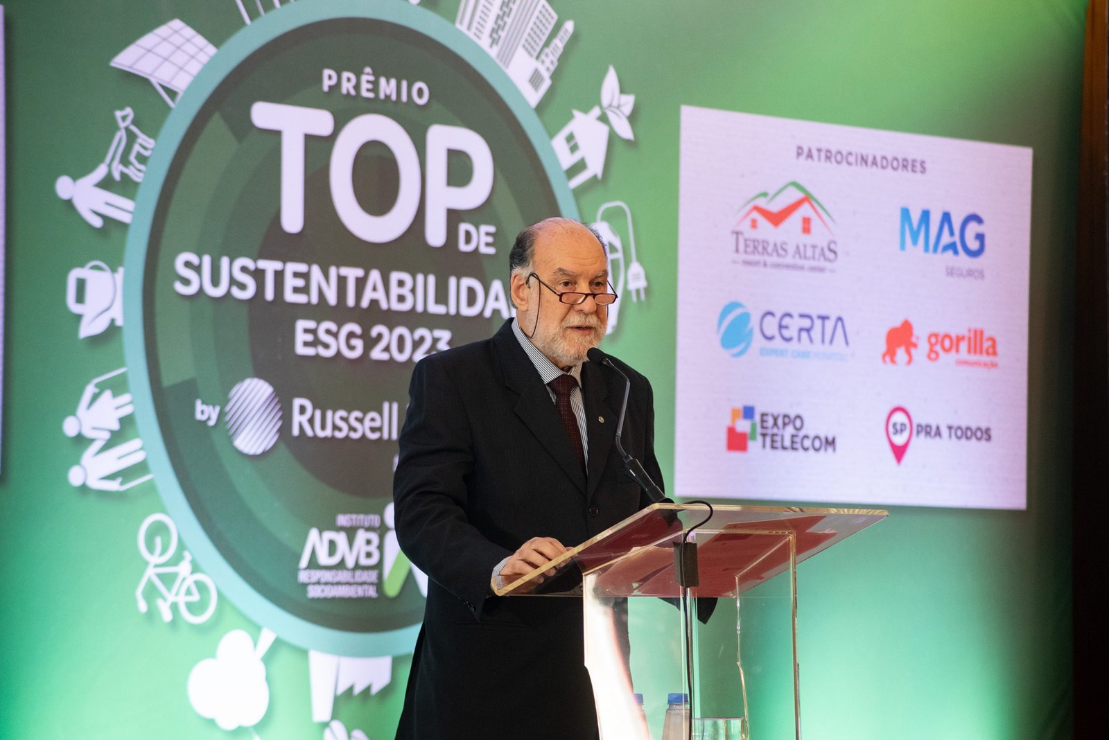 O Prêmio Top de Sustentabilidade ADVB 2023 contou com o patrocínio master da RUSSELL BEDFORD Brasil e com os patrocínios da CERTA Expert Care Hospital, MAG Seguros, TERRAS ALTAS Resort & Convention Center, GORILLA Comunicação, EXPO Telecom e SP PRA TODOS.